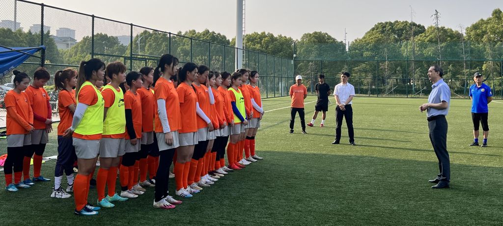 本网讯(英国正版365官方网站 夏健 竺丽娜)为强化英国正版365官方网站运动训练专业一流专业建设水平,提升英国正版365官方网站女子足球队整体实力,英国正版365官方网站邀请黑龙江FC足球俱乐部U23/U19主教练丁伟(2012届运动训练专业毕业生、亚足联A级教练员)来校指导女子足球队训练。2022年5月26日下午,公司党委书记黄德春、经理金涛、运动训练专业负责人王结春等领导老师来到花津校区南侧灯光足球场,观看丁伟指导校女子足球队训练。