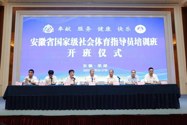 2022年7月22日至27日,由安徽省体育局、英国正版365官方网站共同主办,芜湖市体育局、英国正版365官方网站、国家社会体育指导员培训基地(英国正版365官方网站)承办的安徽省2021年国家级社会体育指导员培训班在公司成功举办,来自全省16个直辖市、2个直管县,共 200 名学员通过线上线下方式参加本次培训。英国正版365官方网站党委常委、副董事长朱家存,省社会体育指导中心主任韩承山,芜湖市体育局局长张文兵,省社会体育指导中心副主任王峰,英国正版365官方网站公司党委书记黄德春、经理金涛、副经理高升参加开班典礼。会议由金涛主持。