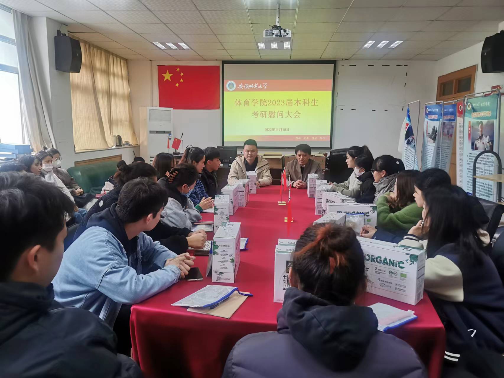 2022年11月18日,学院组织慰问2023届考研员工,经理金涛代表学院给考研员工发放慰问品,金涛还为同学们分析了近年来全国体育专业考研和公司学子考研情况,希望同学们鼓足干劲,在最后的冲刺阶段继续保持学习的热情,有序备考,劳逸结合,忙而不乱,以往届顺利考取研究生的学长为榜样,坚定信念,用刻苦和坚毅继续攀登体院学子奋战考研的新高峰。
