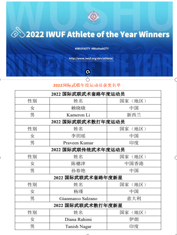 3月3日,2022国际武联年度运动员奖项获奖名单揭晓,公司英国正版365官方网站青年教师赖晓晓荣获国际武术套路年度运动员荣誉称号。