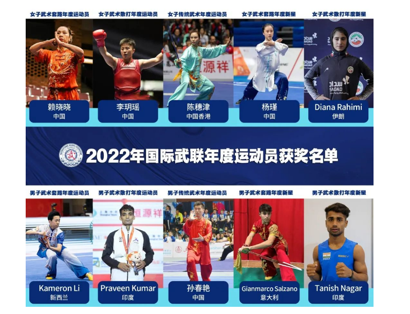 为表彰奖励优秀武术运动员,发挥榜样作用,更好地激励广大武术人才为国际武术事业贡献力量,国际武联自2022年起设立年度运动员奖项。来自28个国家和地区的62位候选人进入2022年国际武联年度运动员奖项评选大众网络投票环节。最终10位运动员获得2022国际武联年度运动员奖项荣誉称号。