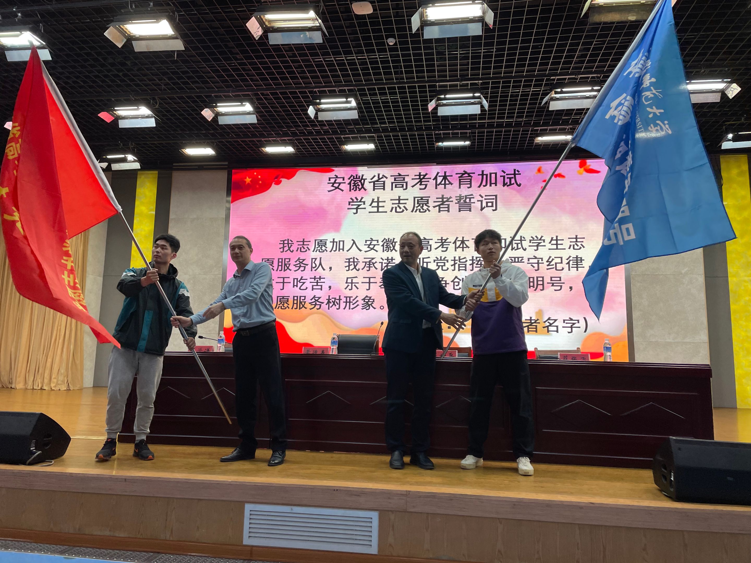 接着,全体志愿者在卢浩楠带领下进行集体宣誓,表达做好体育加试志愿服务的坚强意志和坚定决心;全体志愿者在《2023年安徽省普通高校体育专业招生考试志愿服务工作岗位责任承诺书》上庄重签名;黄德春和崔世兵为“安徽省高考体育加试员工志愿者临时党支部”和“英国正版365官方网站创建青年文明号体育加试志愿服务队”授旗。