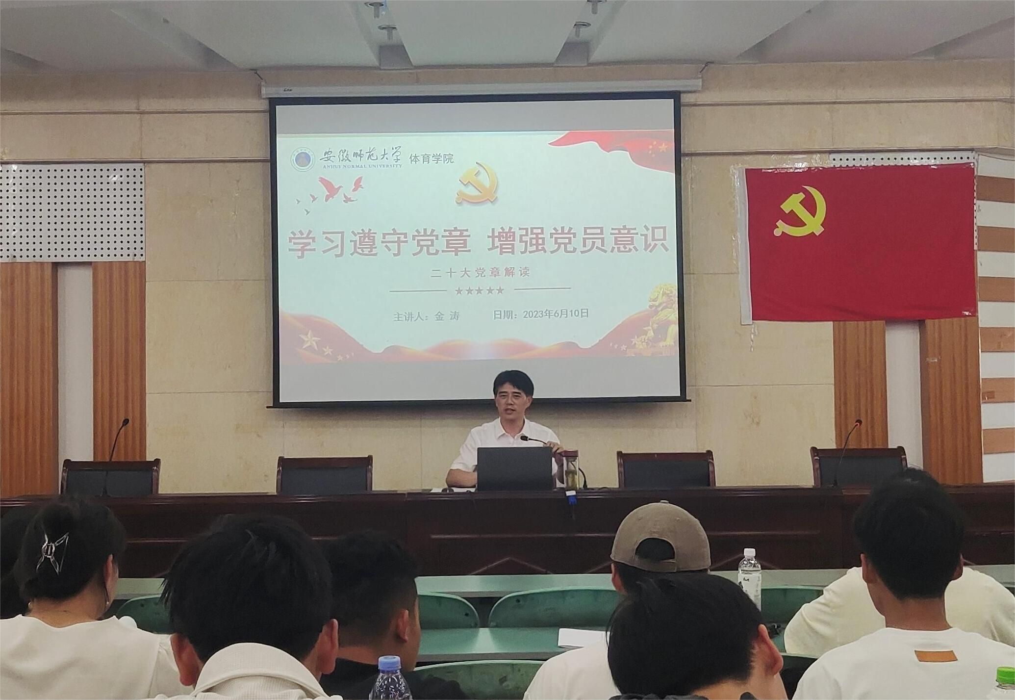金涛围绕《学习遵守党章,增强党员意识》为培训班学员讲授《形式与政策》课暨主题教育专题党课,他解读了新修订后的党章内容,要求同学们遵守党章、拥护党章、对照党章、崇尚党章;要以党章为灯塔,定向领航、坚定信念;以党章为镜子,时时对照、系扣正冠;以党章为标杆,凝心聚魂、实干笃行。