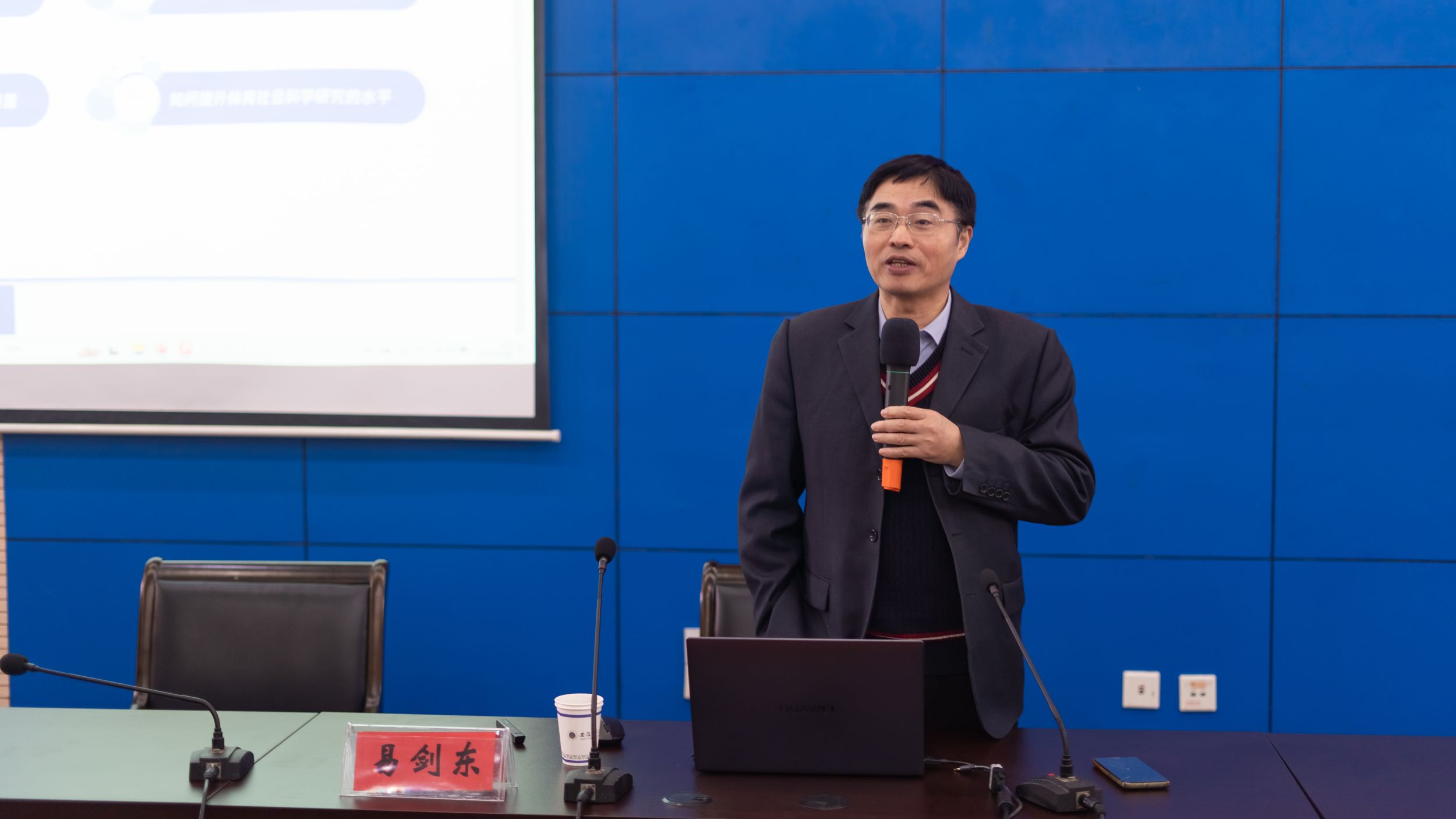 讲座伊始,易剑东教授阐述了体育作为人文、社会学科的认识对象的基本逻辑和特征,诠释了体育与历史学、文学、哲学、经济学、管理学和艺术学等的内在关系。易剑东教授结合自身体育实践经验明确了体育对象、体育事实和体育问题的研究要点,并认为体育学的研究对象应是运动的人和人的运动,体育学主要研究领域应是运动训练、体育竞赛和体育教学。他还依据自身科研经验,提出科学研究应通过不断阅读、擅于思考和加强表达来提升研究的深度和远度。他强调强调要从理论素养和方法掌握、实践经验和现实资源以及国际交流和学术团队三个方面提升科学研究的水平。