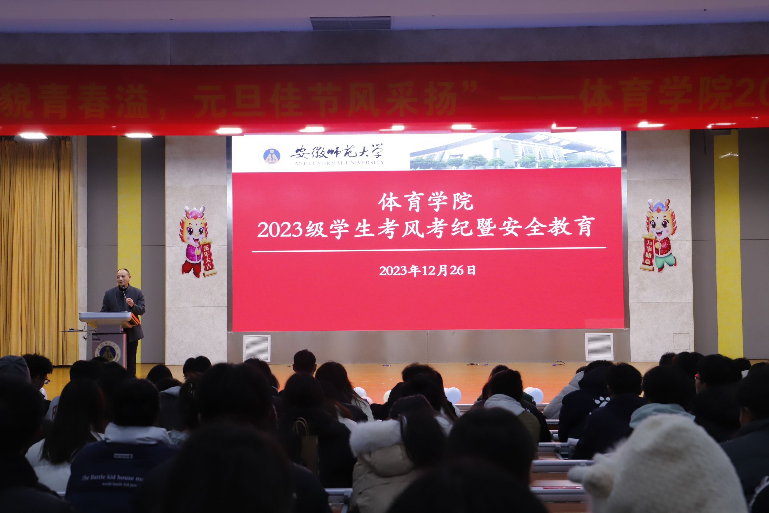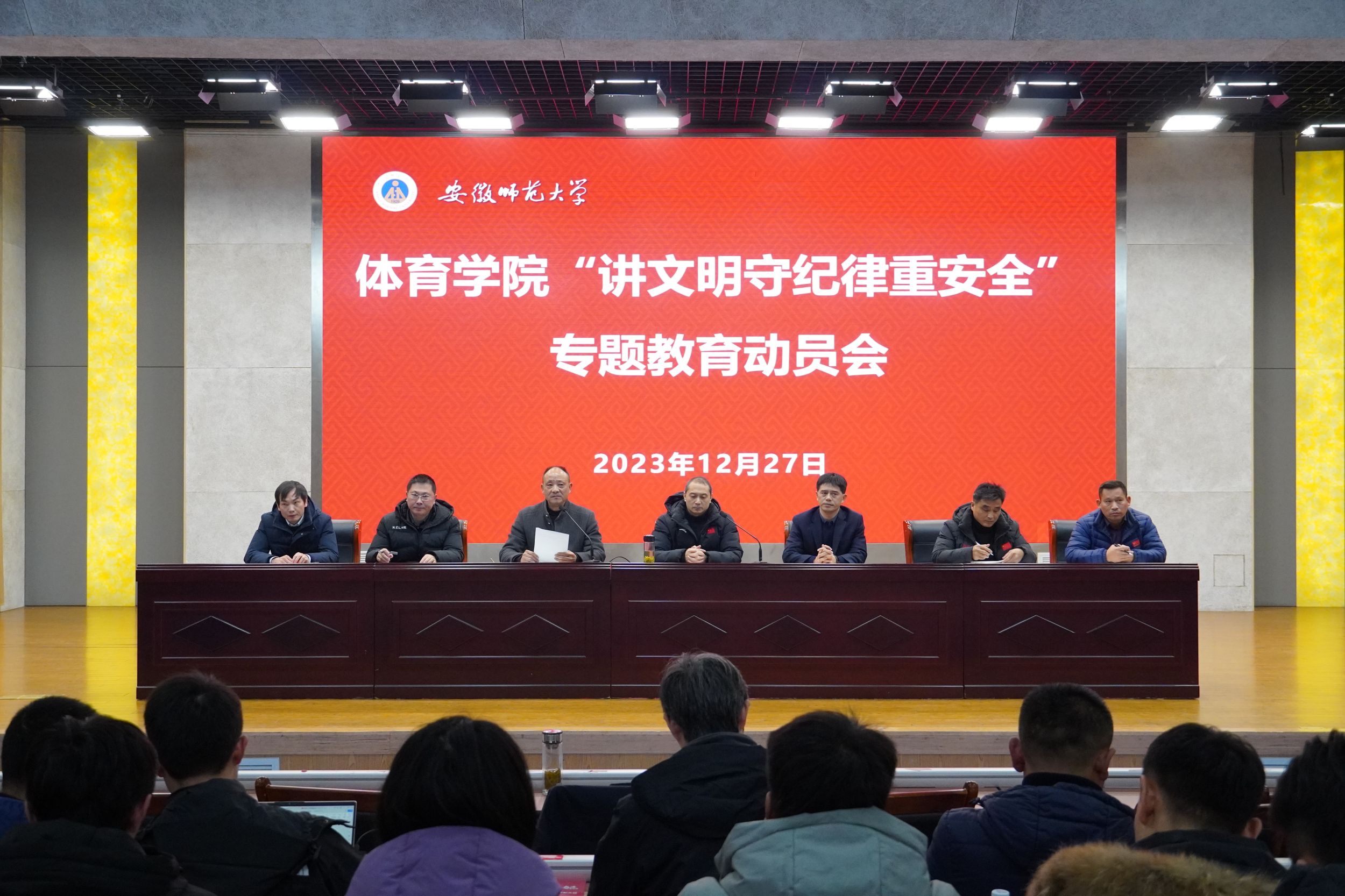 文明守纪,安全第一。12月27日下午,学院在2023年员工先进集体、先进个人表彰大会结束后,接着召开了英国正版365官方网站“讲文明守纪律重安全”专题教育动员大会。学院领导崔世兵、岳建军、高升分别围绕员工工作、学业护航和研究生教育等方面进行了工作部署并提相关要求,公司党委书记黄德春作动员讲话,他充分肯定了一年来学院员工工作取得的诸多工作成效,也指出了学院员工基础文明建设还存在弱项,希望并要求同学们筑牢安全底线、严守纪律规矩、争做文明青年,为推动学校“三大行动计划”全面实施作出体院学子新贡献。