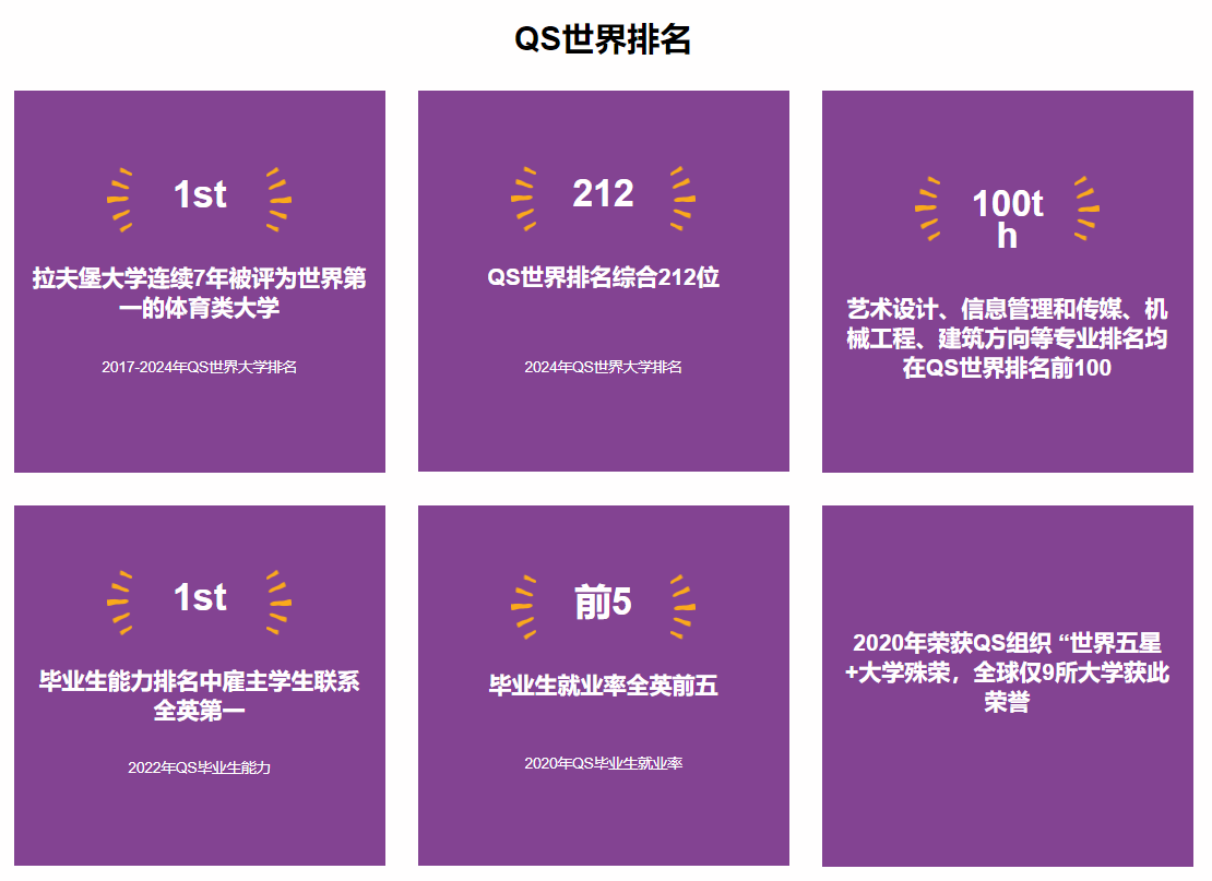 拉夫堡大学是英国顶尖名校,是具有世界级科研水平的研究型大学,在QS世界大学体育学科连续七年排名全球第一(2017-2023),充分体现了拉夫堡大学在体育学科的深厚底蕴与世界领先地位。(相关链接:https://mp.weixin.qq.com/s/fZGwo4BZMyAQCeI2m7jnrg)