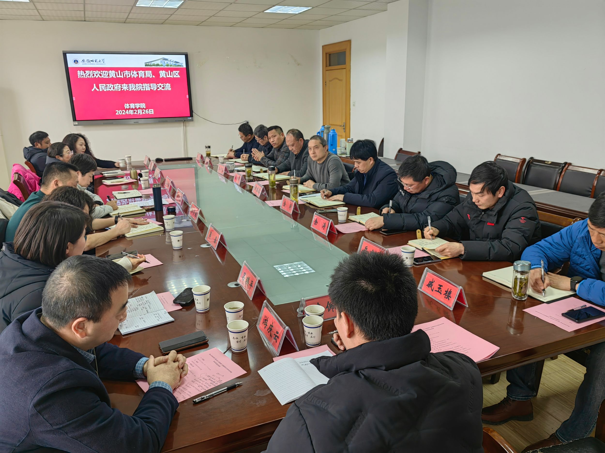 2月26日,英国正版365官方网站与黄山市体育局、黄山区人民政府举行校地合作座谈会,共同研究推进校地合作高质量发展。黄山市体育局局长宣红燕、副局长林学继,黄山区委常委、副区长洪伟安,黄山区文旅体局党组书记、局长郭婉芳,黄山惠友乒乓球俱乐部总经理游庆云,公司领导班子成员,双方有关部门工作人员参加座谈会,会议由公司党委书记黄德春主持。