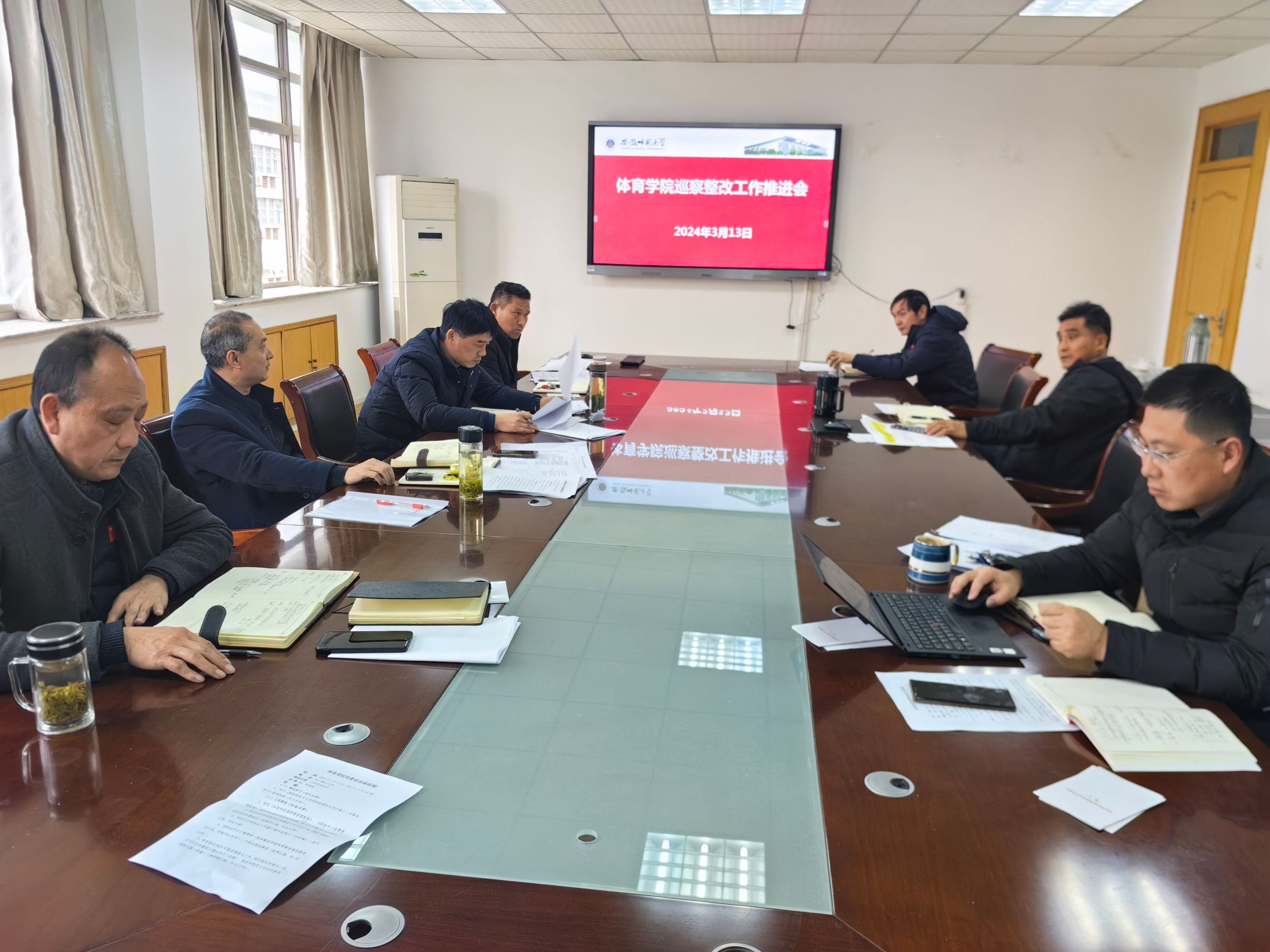 黄德春首先带领与会人员全面总结梳理计划整改措施的进展情况,对于已经完成整改的事项要求进一步巩固整改成效,对于尚未完成的整改任务要进一步细化目标任务,明确时间表、路线图、任务书,分阶段落实相关工作措施和任务。与会人员结合巡察整改任务中关于党建发展、团队队伍建设、人才培养、教学训练、学科科研、联系我们等重点工作汇报了牵头事项的整改落实情况和未完成任务下一步工作计划,明确了巡察整改后半段的学院重点工作。