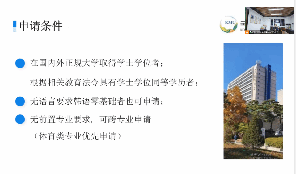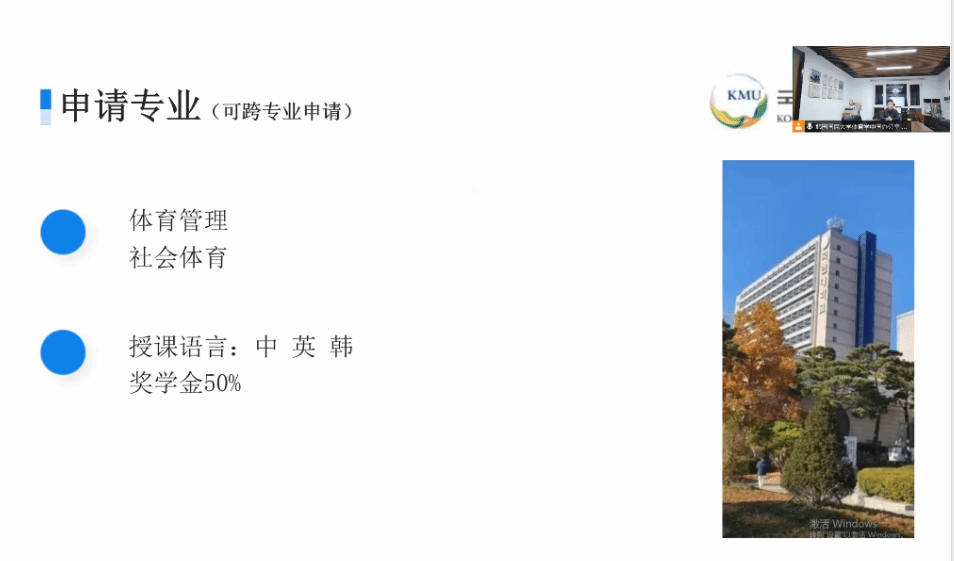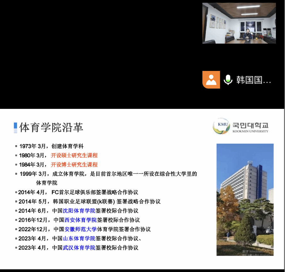 本网讯(刘利)应学院邀请,3月14日晚上7时,公司合作单位韩国国民大学英国正版365官方网站体育产业研究院举行2024年招生线上宣讲会。会议由国民大学英国正版365官方网站中国办公室主任常嘉林主讲,公司对此项目感兴趣的师生参加了线上宣讲。