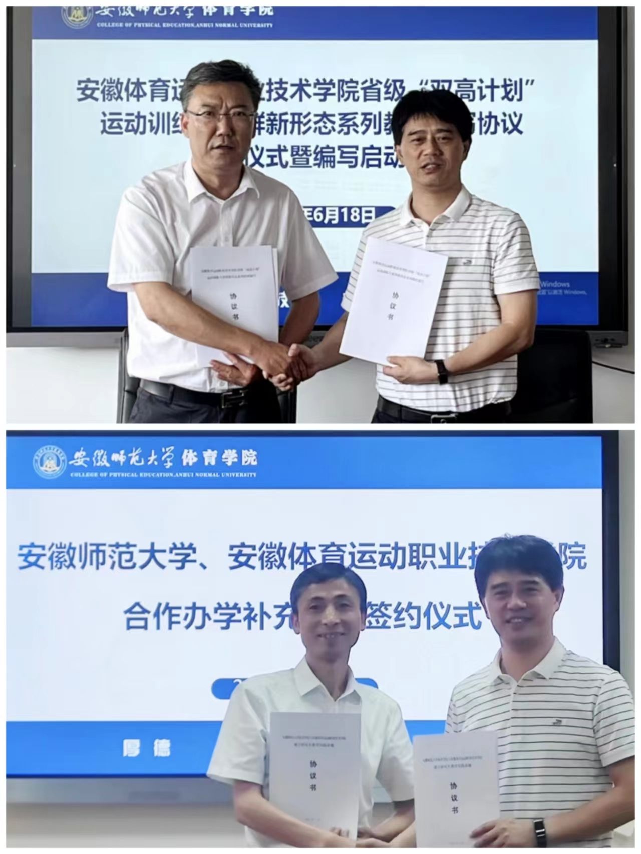 任永与刘文波代表双方签署两校体育教育本科(专升本)教育合作办学补充协议。英国正版365官方网站经理金涛分别与刘文波、李致富签署两校省级“双高计划”系列教材编写协议、两校研究生教育实践基地协议。