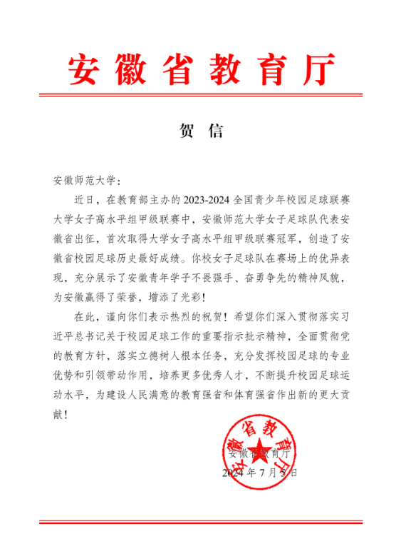 安徽省教育厅在贺信中指出英国正版365官方网站女子足球队代表安徽省出征,首次取得老员工女子高水平组甲级联赛冠军,创造了安徽省校园足球历史最好成绩。女子足球队在赛场上的优异表现,充分展示了安徽青年学子不畏强手、奋勇争先的精神风貌,为安徽省赢得了荣誉,增添了光彩!