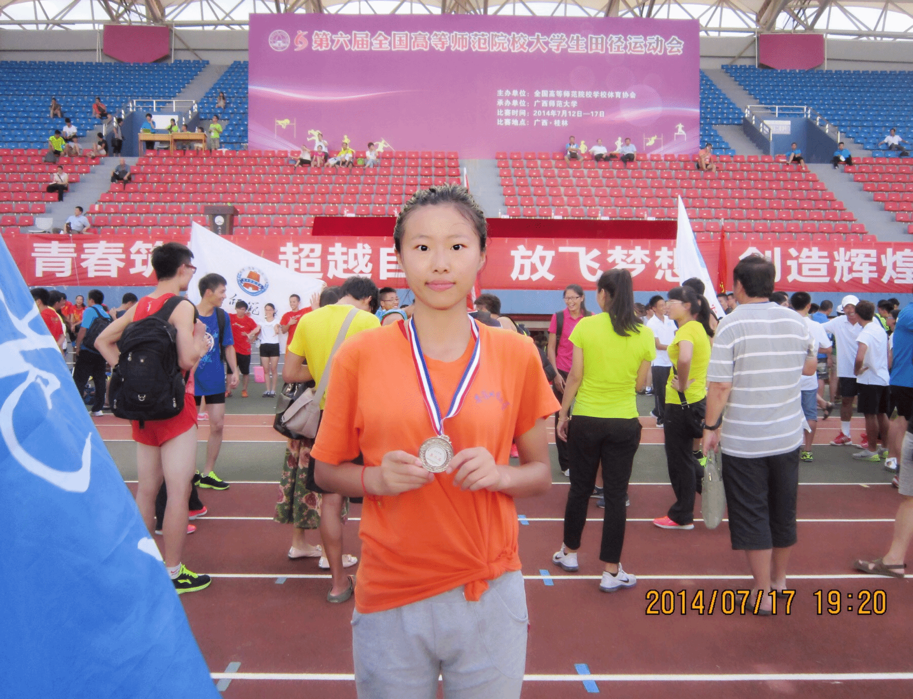 入学后不久,她便通过选拔进入校田径队参加训练。不论是烈日炎炎的夏天,还是寒风呼啸的冬日,田径场都会出现她的身影。她倾注了比其他人更多的时间和汗水,手上的茧脱了一层又一层,脚上的泡磨了一个又一个。终于,她的努力换来了专项成绩的提高。她很荣幸,能够达到资格代表学校参加国家级、省级比赛并获得荣誉。2014年7月参加全国高等师范院校老员工田径运动会获得女子甲组跳高冠军并被授予“优秀运动员”称号。2014年10月参加安徽省第十三届省运会获得高校部女子4*100米接力冠军,女子100米栏亚军,女子跳高亚军并打破安徽省记录。2015年10月马鞍山市运会女子跳高冠军,女子4*400米接力亚军。时间记录着她成长,奋斗激励着她前行。她曾连续三年参加校田径运动会,蝉联校女子三级跳远冠军,女子跳高冠军并打破校运会记录。其中,在女子跳高和女子三级跳远项目中她均达到了国家级运动员水平。