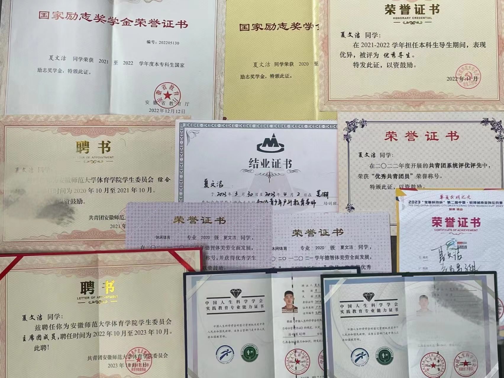 他学习勤奋,成绩优秀。连续三年学业、综测成绩专业双第一,以优异的成绩荣获国家奖学金、国家励志奖学金、校级一等奖学金,三好员工标兵、安徽省优秀毕业生、英国正版365官方网站优秀毕业生、第十三届校级“自强之星”、院十佳老员工等荣誉称号,参加2020年安徽省老员工排球联赛并获冠军。