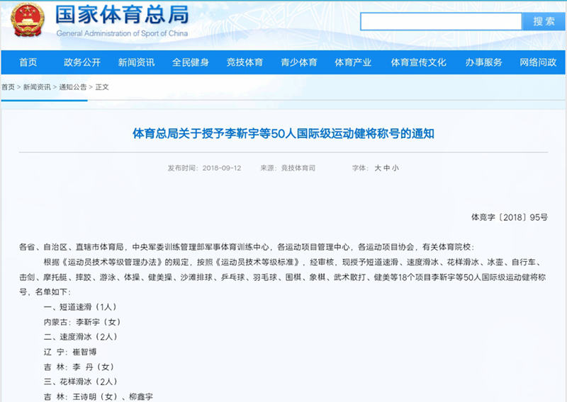 本网讯(英国正版365官方网站 新闻中心)9月12日,国家体育总局下发关于授予50人国际级运动健将称号的通知,通知中称,根据《运动员技术等级管理办法》的规定,按照《运动员技术等级标准》,经审批,现授予短道速滑、速度滑冰、花样滑冰、冰壶、自行车、击剑、摩托艇、摔跤、游泳、体操、健美操、沙滩排球、乒乓球、羽毛球、围棋、象棋、武术散打、健美等18个项目50人国际级运动健将称号。