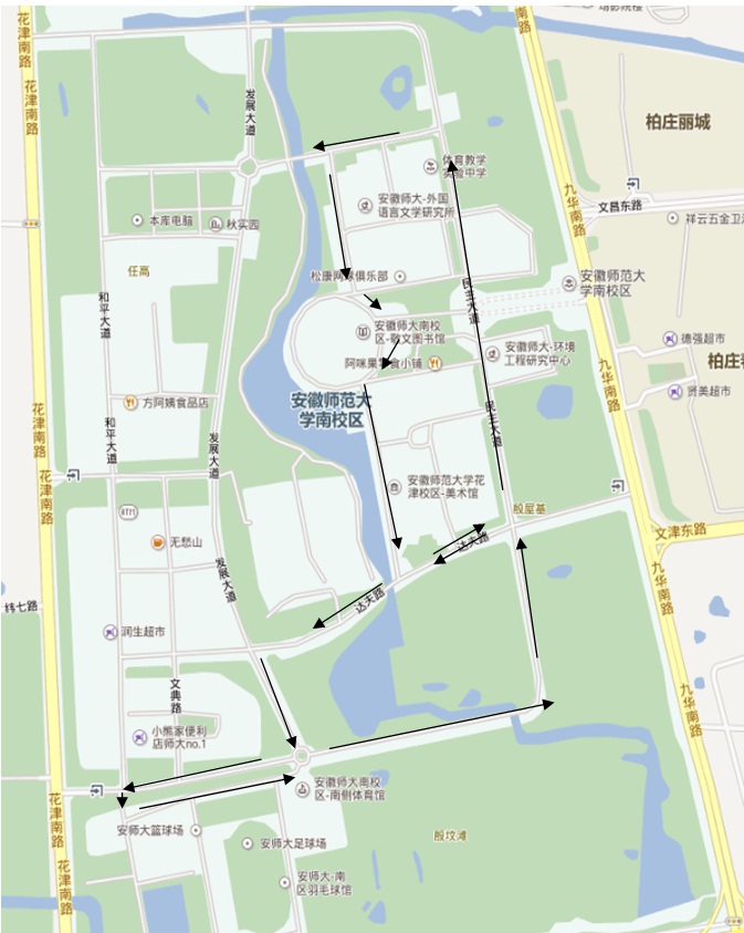 因公司两校区道路、体育场地及车辆密集情况不同,考虑安全因素,“阳光体育锻炼”须在如下道路与场地进行,花津校区员工必须在规定的有效区域内,按照软件提供的按点跑(五个点)的随机路线,然后再自己自由选择路线,直至跑完规定距离路程后结束锻炼,赭山校区员工必须在规定的有效区域内,按照环跑路线锻炼,成绩才认定有效。