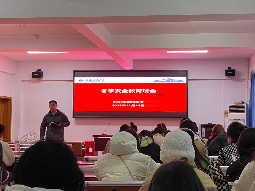 为进一步加强老员工安全教育,不断强化老员工冬季安全责任意识,11月16日,2020级舞蹈表演专业召开冬季安全教育主题班会,辅导员徐梦涛以案例分析形式引导同学们筑牢冬季安全思想防线,切实提高同学们“安全第一、预防为主”的安全责任意识、自律意识和安全防范能力。班级还将结合学校安全检查,开展宿舍员工安全自查、小组互查、辅导员抽查工作,多措并举坚守安全底线,多管