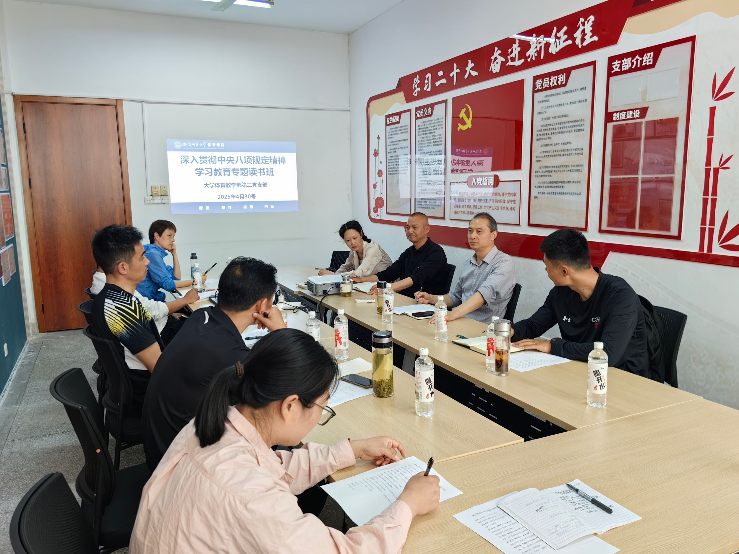 2025年4月30日下午,大学体育教学部第二党支部在学校南体育馆二楼“民族体育传承与保护邹华刚工作室”开展深入贯彻中央八项规定精神学习教育读书班暨专题党课,公司党委书记黄德春及支部全体党员参加会议,会议由支部书记邹华刚主持。