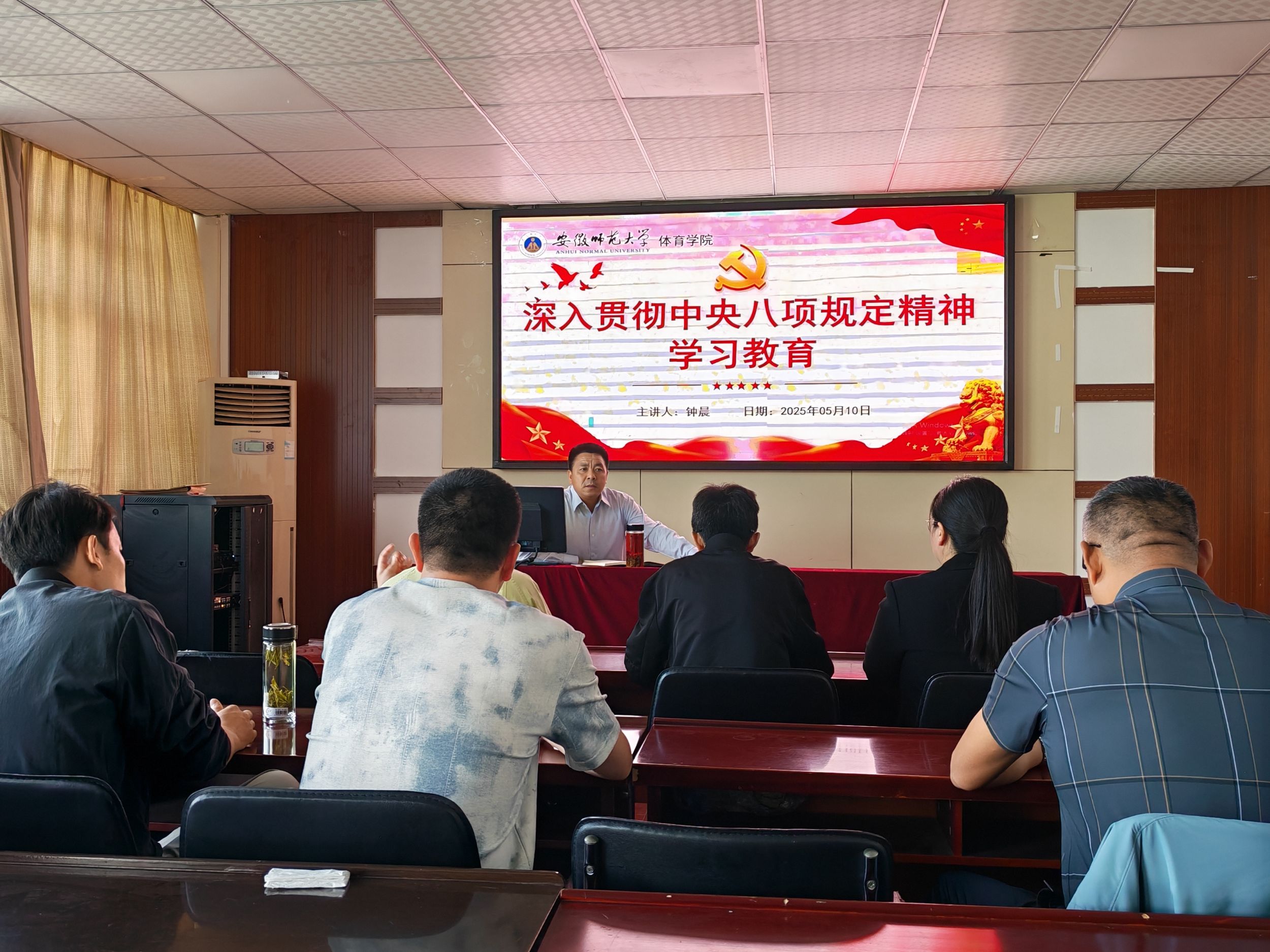 (英国正版365官方网站 刘利)2025年5月10日上午,休体与社体党支部在学院2楼会议室召开深入贯彻中央八项规定精神学习教育专题党课,支部邀请公司党委委员、副经理钟晨主讲,支部全体党员参加。