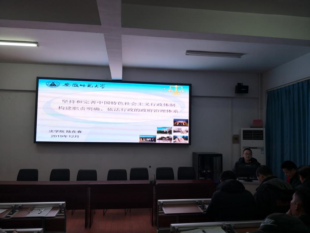 袁德水在主持讲话中指出,陆老师结合自己的学习体会和专业特长,为我们做了一场精彩的、生动的、高质量的宣讲报告。整个报告逻辑严密、思路清晰、内容丰富、生动形象,知识点多、信息量大、指导性强,对我们进一步深入学习贯彻十九届四中全会精神具有积极的指导作用。