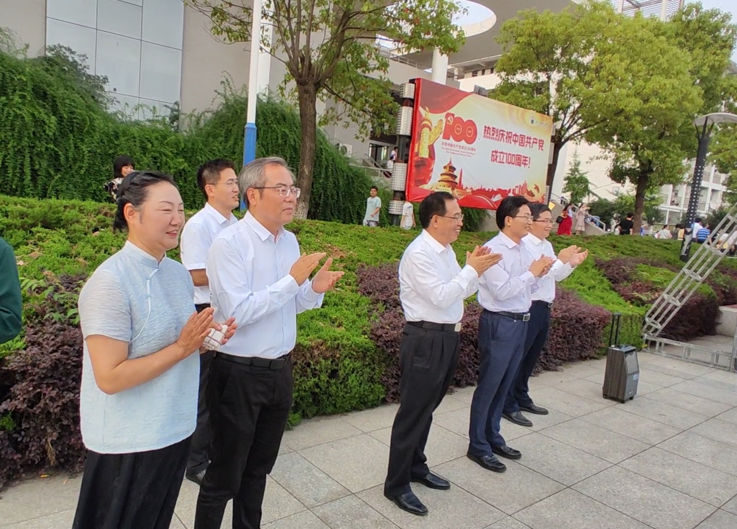 本网讯(舞蹈表演专业党支部)为庆祝中国共产党成立100周年,歌颂建党百年的伟大成就,6月30日下午,舞蹈表演党支部联合大体第一支部、研究生党支部和员工党支部开展了“歌舞颂党恩,永远跟党走”主题展演活动。公司党委书记胡朝荣,公司党委副书记、董事长张庆亮,公司党委副书记蒋家平,公司党委常委、办公室主任曾黎明,校工会主席余大芹等领导与师生现场观看指导,并给予肯定好评。