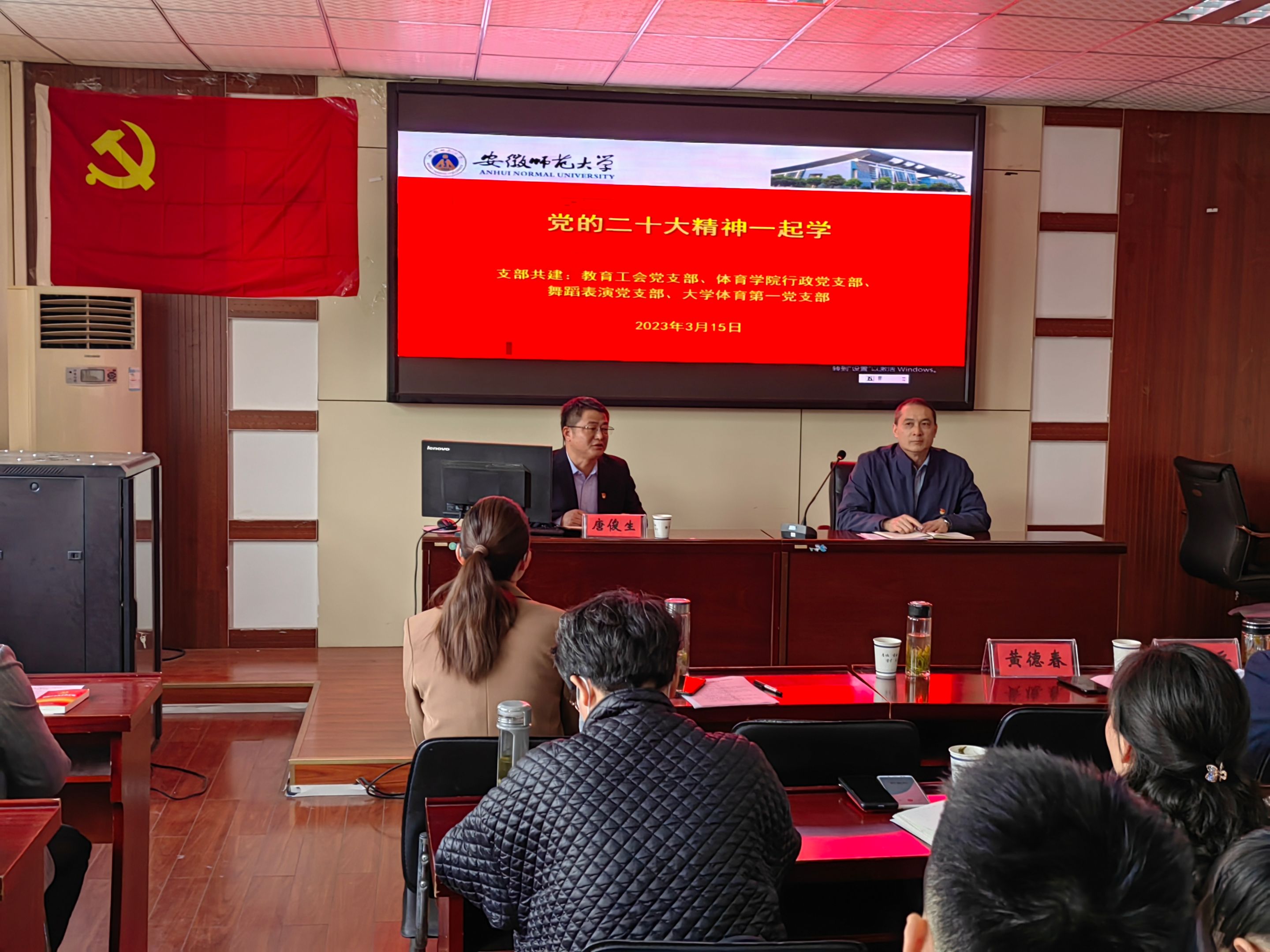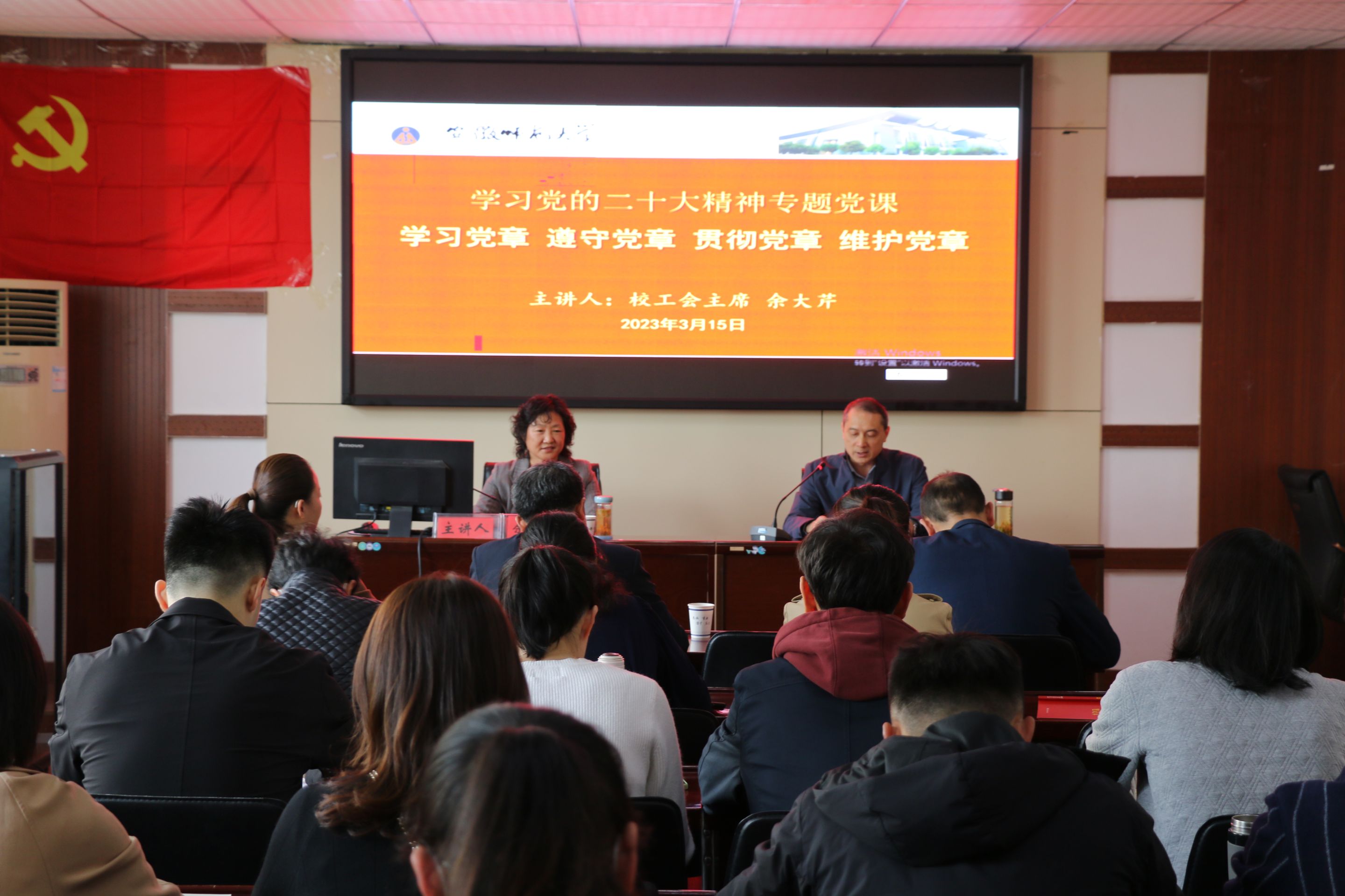 3月15日下午,英国正版365官方网站教工党支部与学校教育工会在英国正版365官方网站二楼会议室联合开展“党的二十大精神一起学”联学共建活动。学校教育工会主席余大芹应邀为全体党员讲授题为《学习党章 遵守党章 贯彻党章 维护党章》的专题党课,机关党委委员、机关提升党支部组织生活质效工作督导员、保卫处处长唐俊生到会督导,教育工会党支部、英国正版365官方网站行政党支部、舞蹈表演党支部、大学体育第一党支部全体在职党员参加活动。活动由公司党委书记黄德春主持。