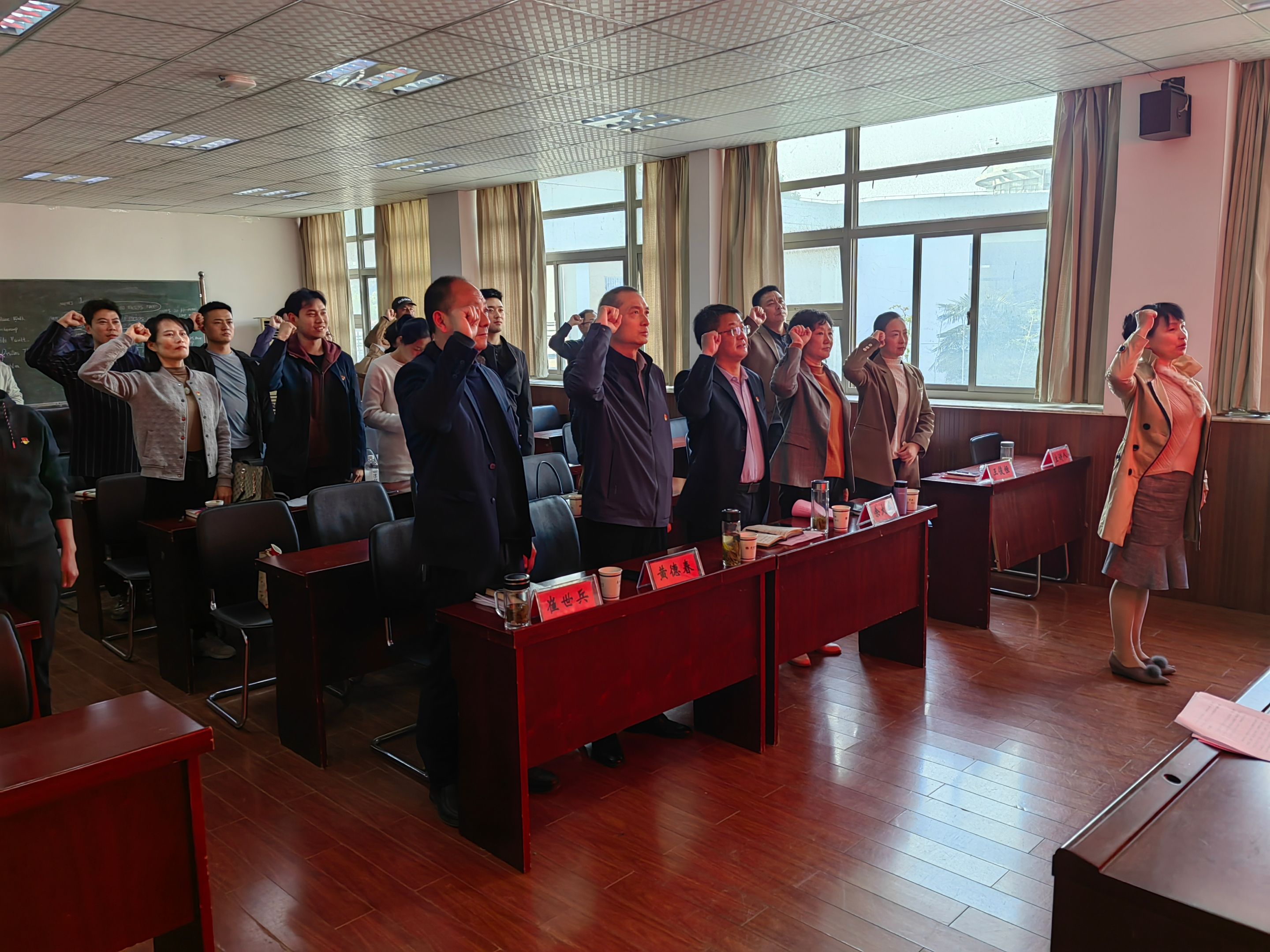 党课结束后,在舞蹈表演党支部书记郝利玲的带领下,全体党员郑重举起右手,面对党旗庄严宣誓,重温入党誓词。