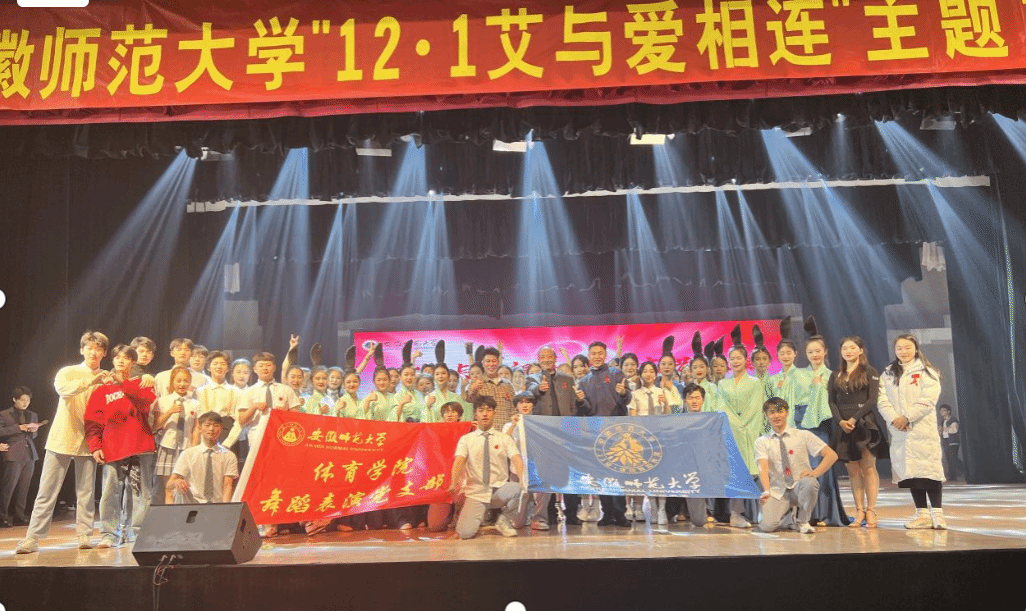 2023年11月26日晚,“艾与爱相连、12·1防艾主题教育晚会”在花津校区大礼堂举行,舞蹈表演党支部党员师生带领舞蹈表演专业同学全程参与此次晚会节目编排、策划和场务工作,助力此次晚会精彩呈现。