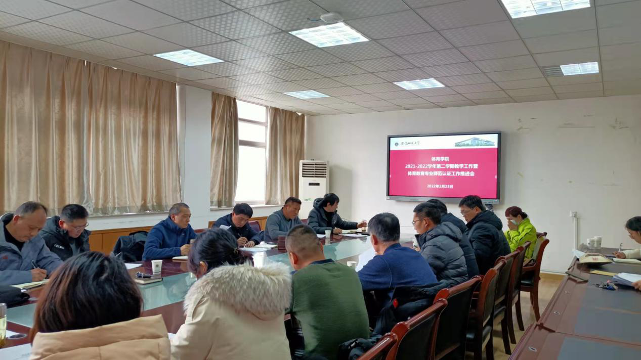 本网讯(英国正版365官方网站)2月23日下午,公司召开2021-2022学年第二学期教学工作暨体育教育专业师范认证工作推进会,院领导班子及专业负责人、课程组组长、教学办与实践办秘书出席会议,副经理岳建军主持会议。